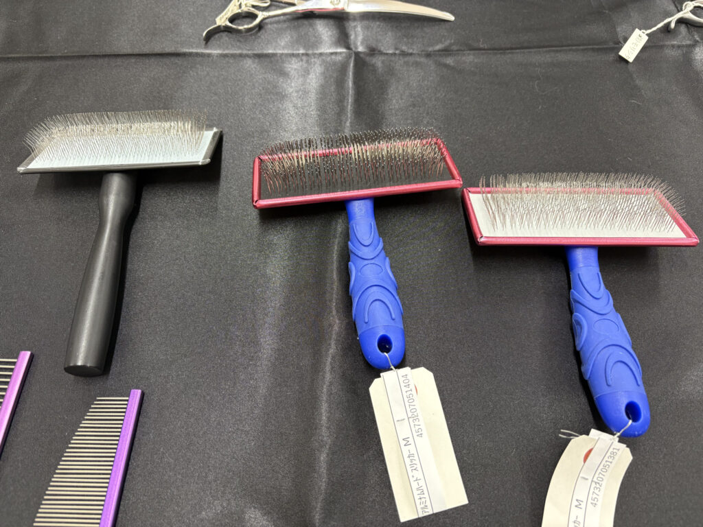 くの字型の針金ピンで抜け毛・毛玉除去や毛並み調整に使うスリッカー
