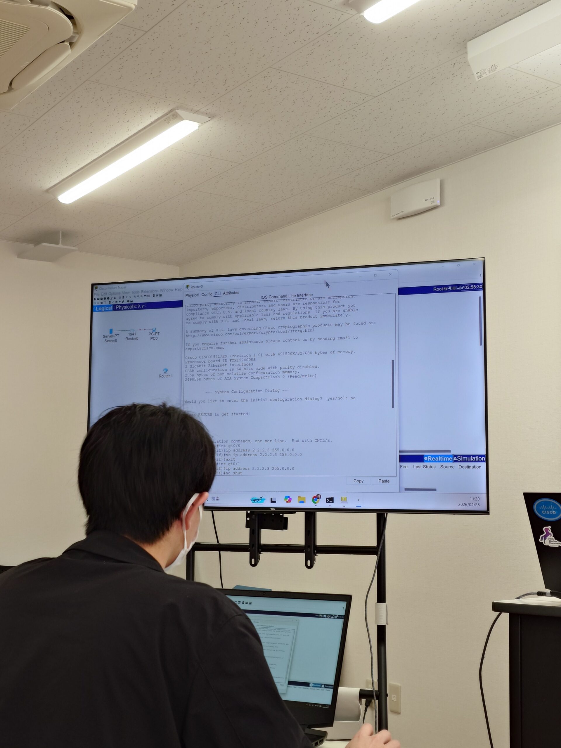授業では、講師の先生による熱いロードマップ解説と、ネットワークエンジニアが行うルーター設定体験を実施しました。 実際にコマンドを入力して、ネットワークを構築する姿は、まるでプロのよう!