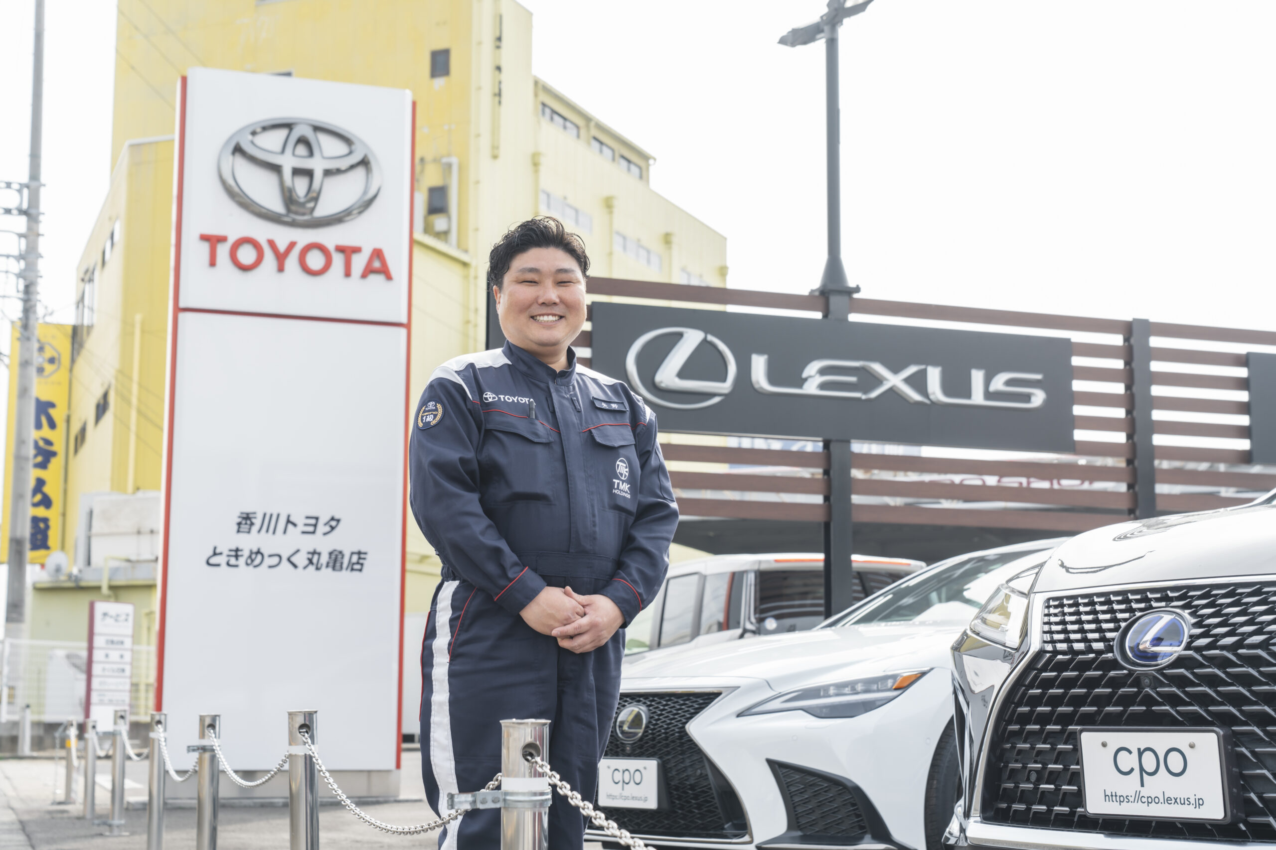 新卒で入職して18年になります。9年間整備に従事し、その後4年間エンジニアリーダーを努めました。次にサービス本部に勤務。現在、サービスチーフリーダーです。トヨタ社の理念や独自の専門知識を学び、先輩エンジニアから指導を受けながら整備士の経験を積む時期を経て、エンジニアリーダーになるとエンジニアの配置や工程を管理して現場をコントロールします。高難易度の修理も任されます。サービス本部では、本部内リーダーとして技術課に所属。「トヨタ検定」という技術検定に合格できるように若手エンジニアの教育や特殊な案件をメーカーとの間に入って協議を任されます。お客様の出迎え、お車の引き渡し、板金修理の見積もりや段取りもします。フロント業務は直接お客様とお話をしますから、質問にも的確に答えられる知識とコミュニケーション能力が求められます。