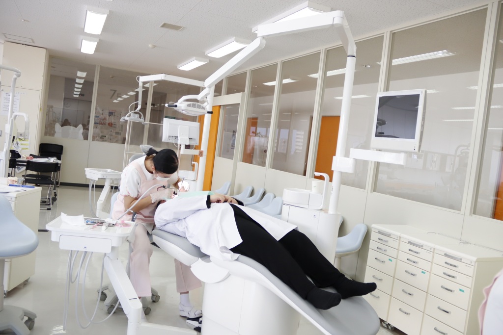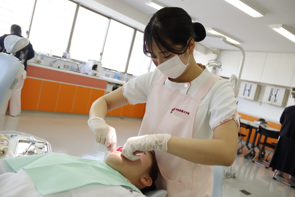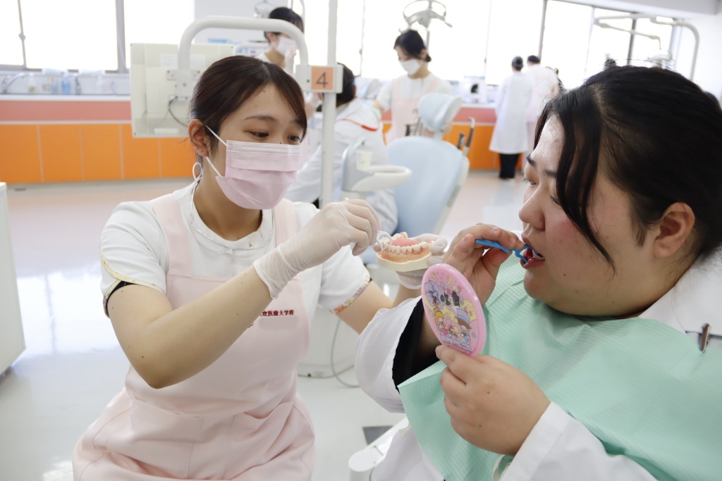 歯科衛生学科の学生は、医療事務学科の学生を患者さんとして、歯肉検査とブラッシング指導を実施。 普段の学生同士の実習とは違い、専門知識がない人に「どう伝えれば正しく磨いてもらえるか?」を考える、より実践的なアウトプットの場となりました。