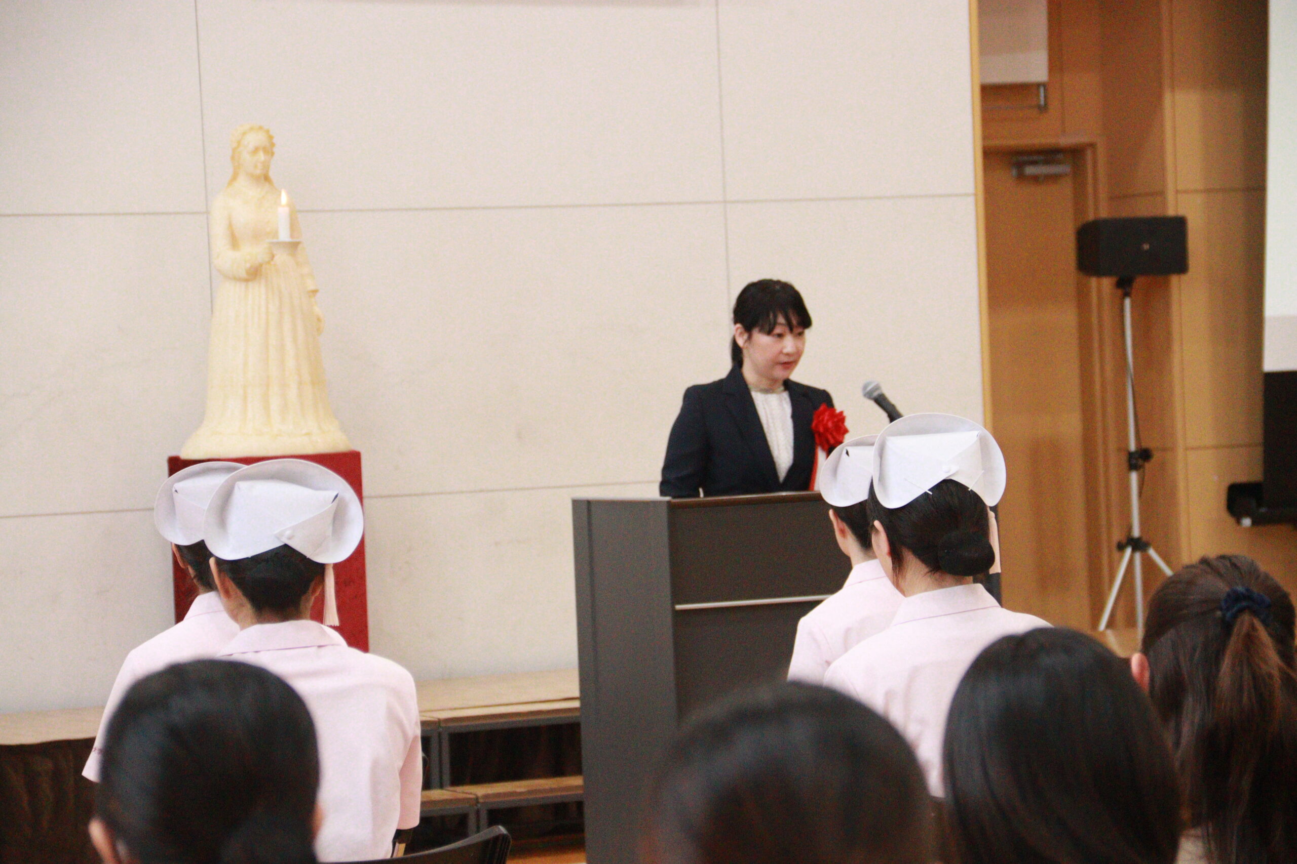 実習先でお世話になるご来賓の看護部長様より、看護の仕事の意義や素晴らしさ、やりがいについてお話しいただき、また、学生たちがこれから歩む道への期待と激励の言葉を頂きました。