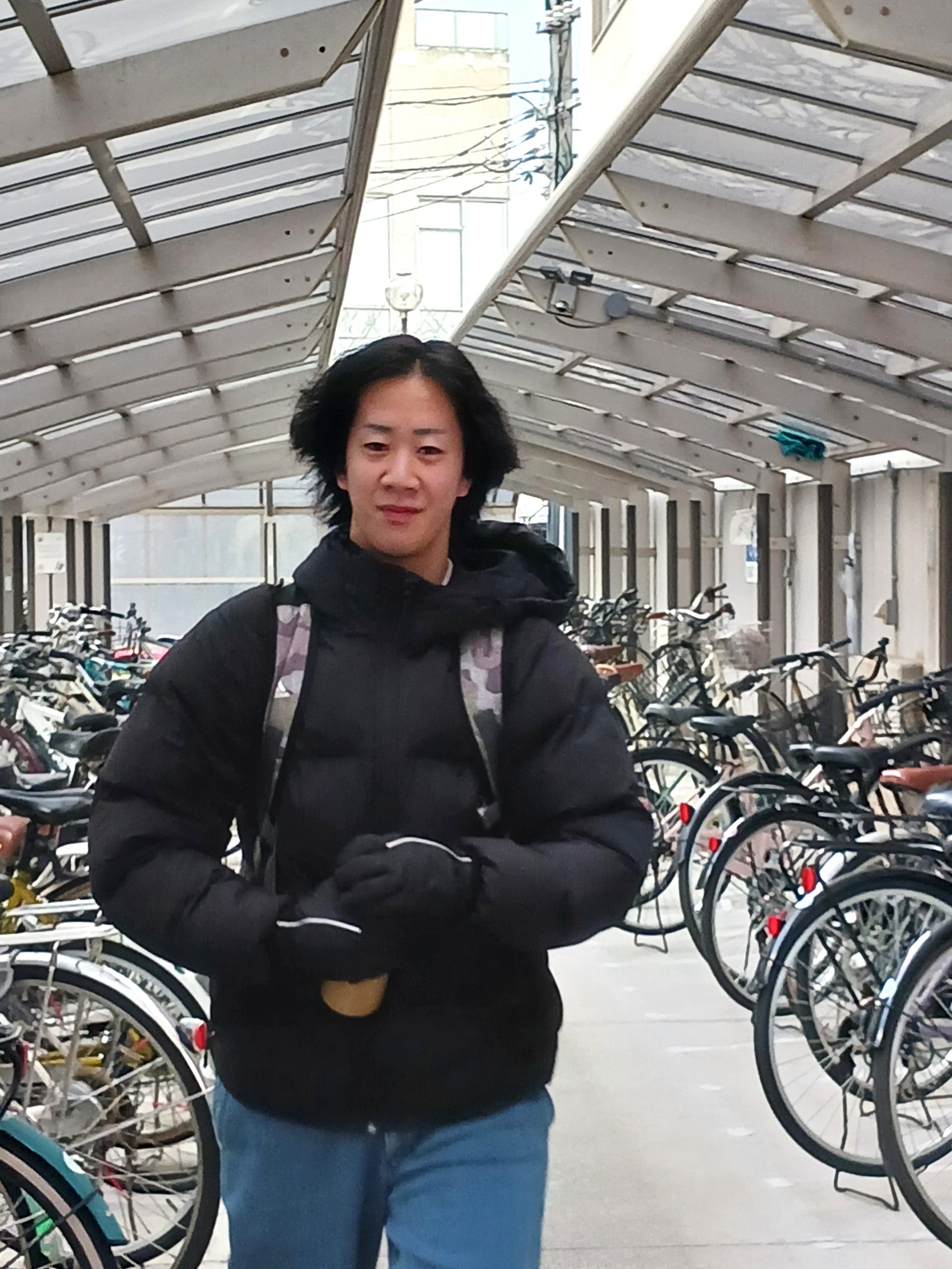 自転車を置いて、荷物を持ちます。寒いので手袋必須ですね。演習や実習がないので、髪は少し長めです(笑)。