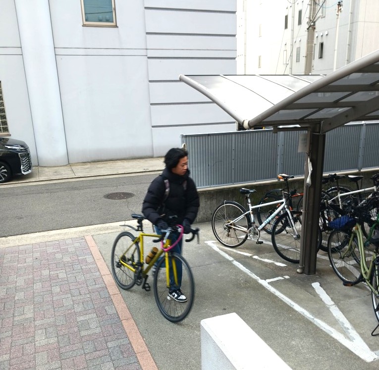 ここ数日、風が強く冷えますね。今日は登校のひとコマを撮影しました。1年生の学生さんが自転車で登校してきました。