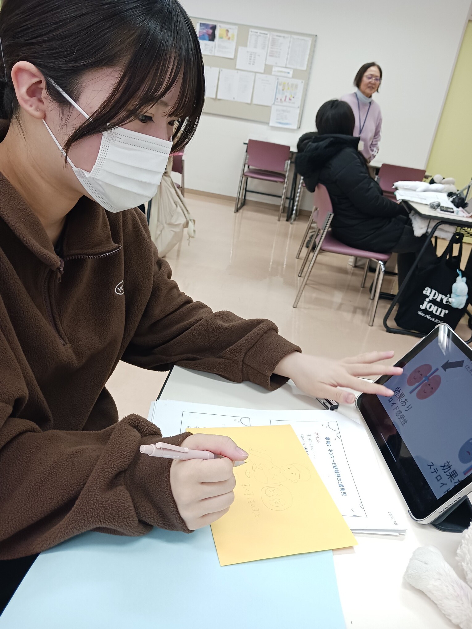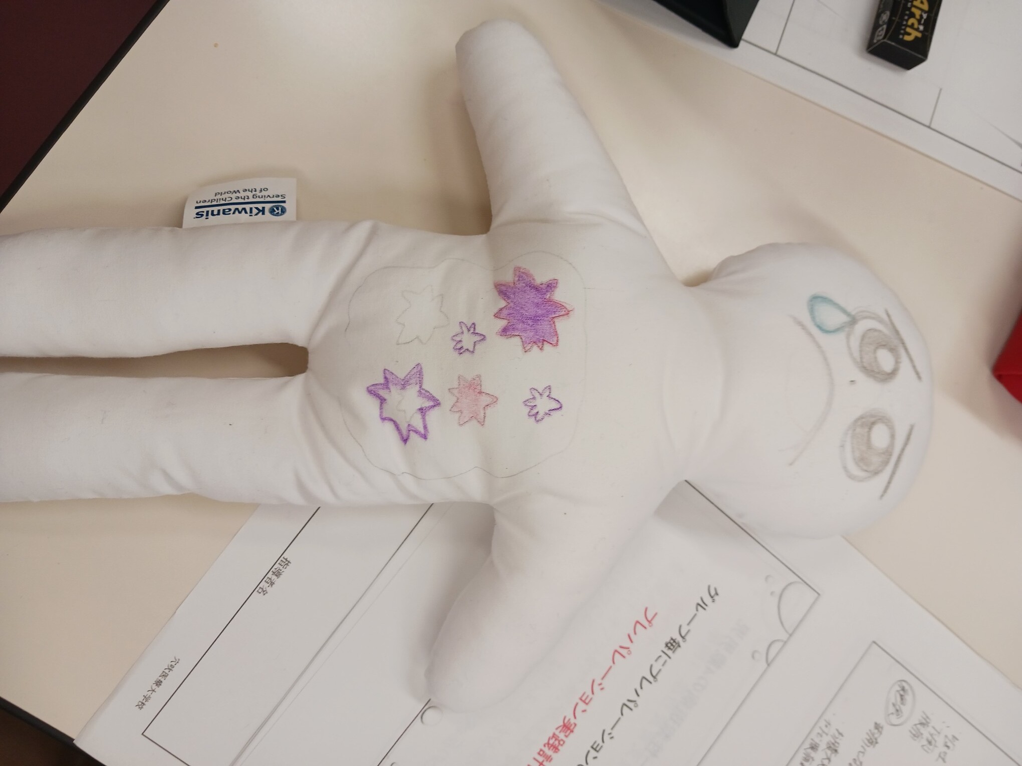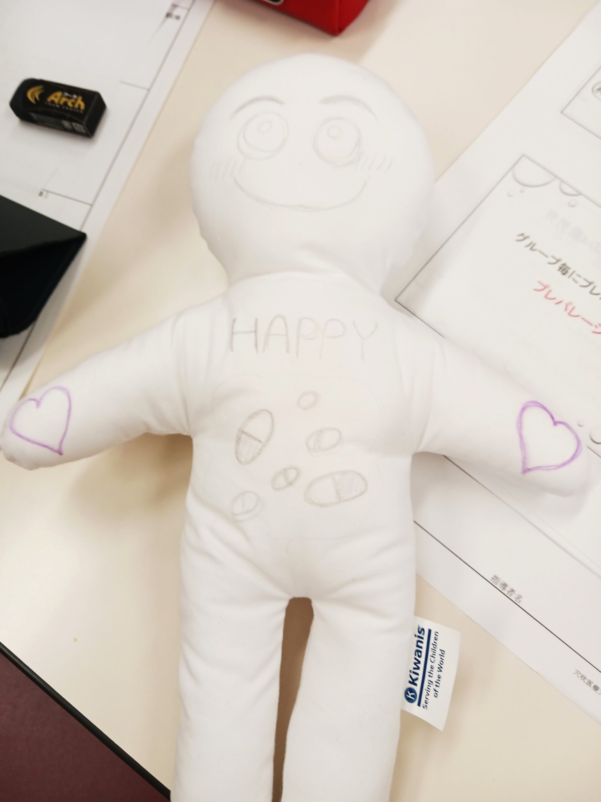こちらは学生が作成したキワニスドールです。表は泣いている表情ですが、両面を使用し治療をして元気になると笑顔になる!という工夫をしています。これから色付けです。どう説明したら伝わるかな?と考えながら色付けしていきます。