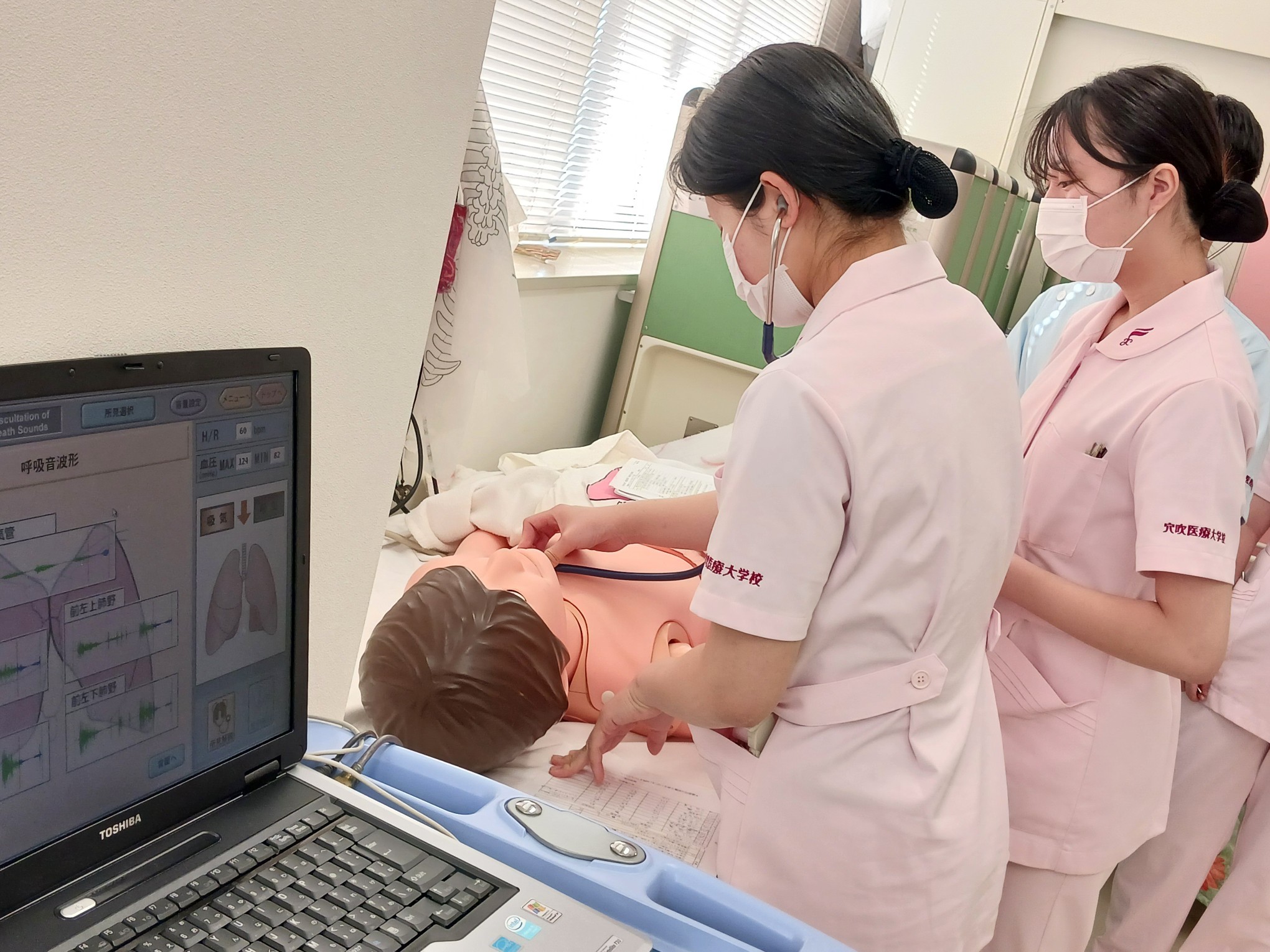 看護学科2年生は、2月から始まる成人老年看護学Ⅰ実習に向けて、演習に取り組んでいます。こちらは、「フィジコさん」というフィジカルアセスメントのモデル人形です。
