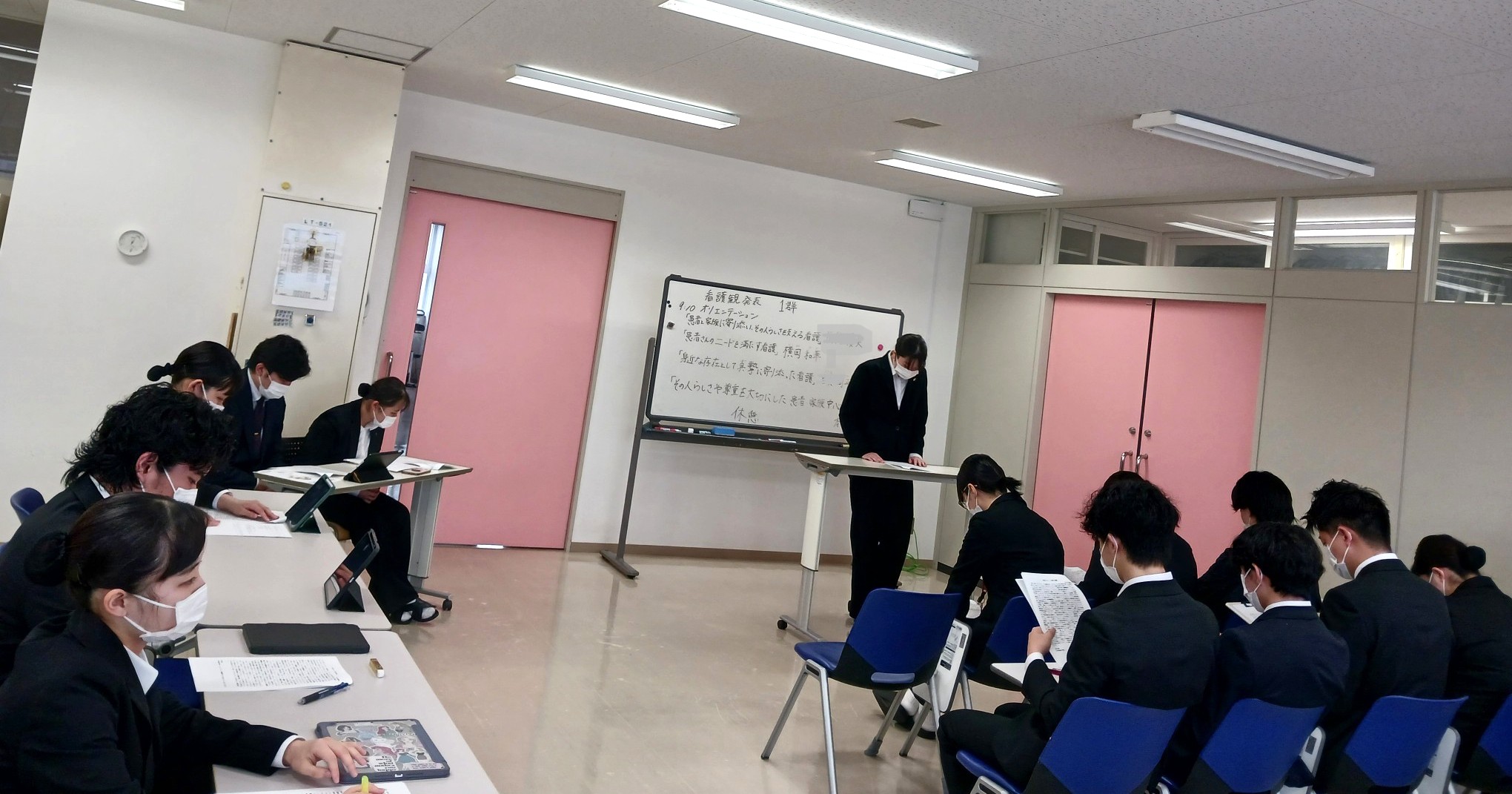 本日は、卒業を前に看護観の発表会でした。1~3年生も参加し、4つの教室に分かれて実施します。この4年間で培った看護に対する想いを文章にし、皆と共有する貴重な時間。どんな想いがあるのでしょうか…。まずは、一人一人の発表がありました。