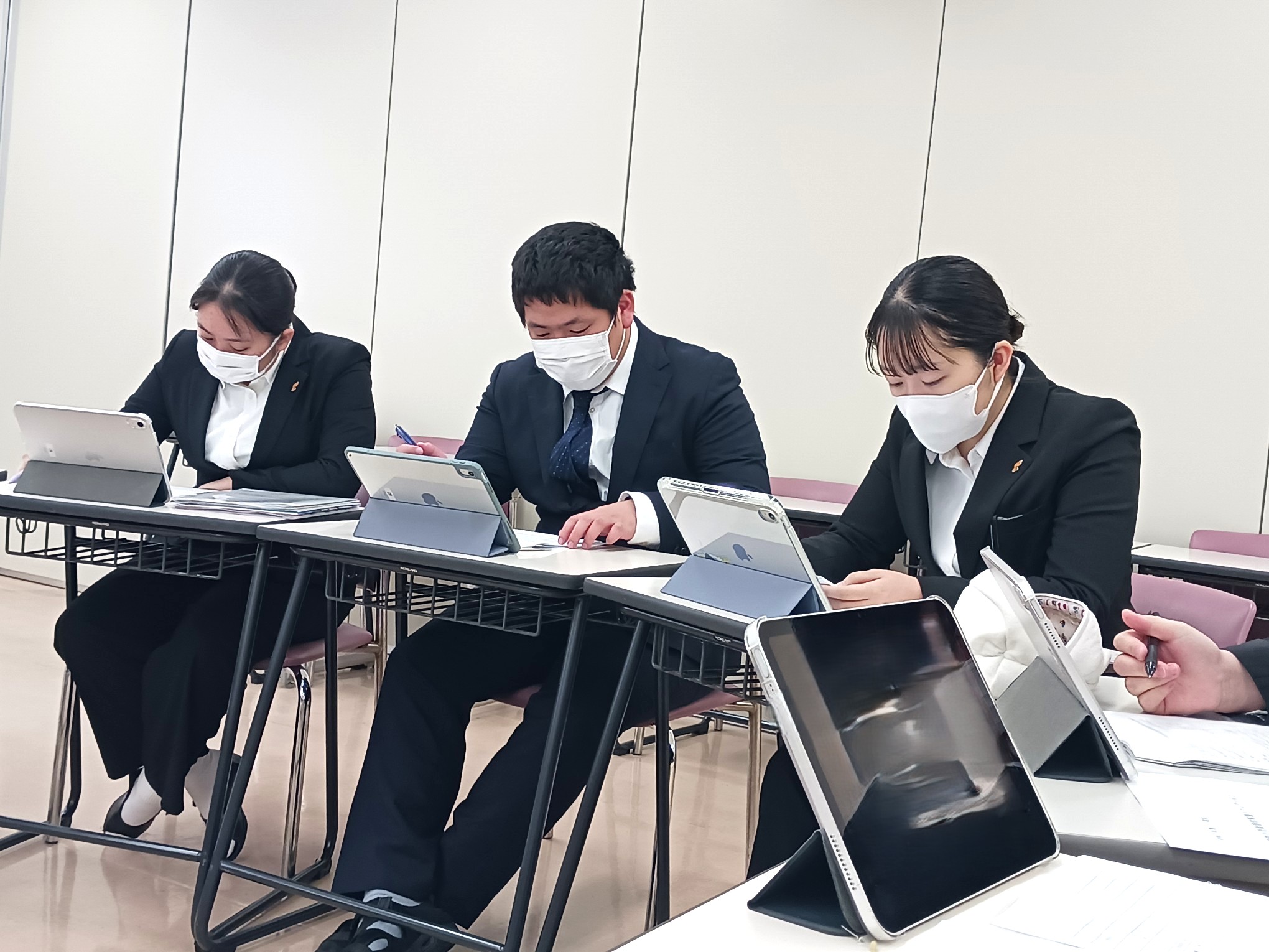 3年次は領域別の実習があり、母性・小児看護学実習もそのひとつです。成人老年看護学実習と違い、日常生活では接することのない妊婦さんや小児とそのご家族の方への看護に戸惑いを感じることが多い実習でした。その思いも含め、実習の振り返りを行いました。今回は、1~3年生がグループになり、座談会形式で意見交換しやすく工夫しています。1.2年生も、分からない言葉はiPadで調べながら進めていきます。便利な時代ですね。