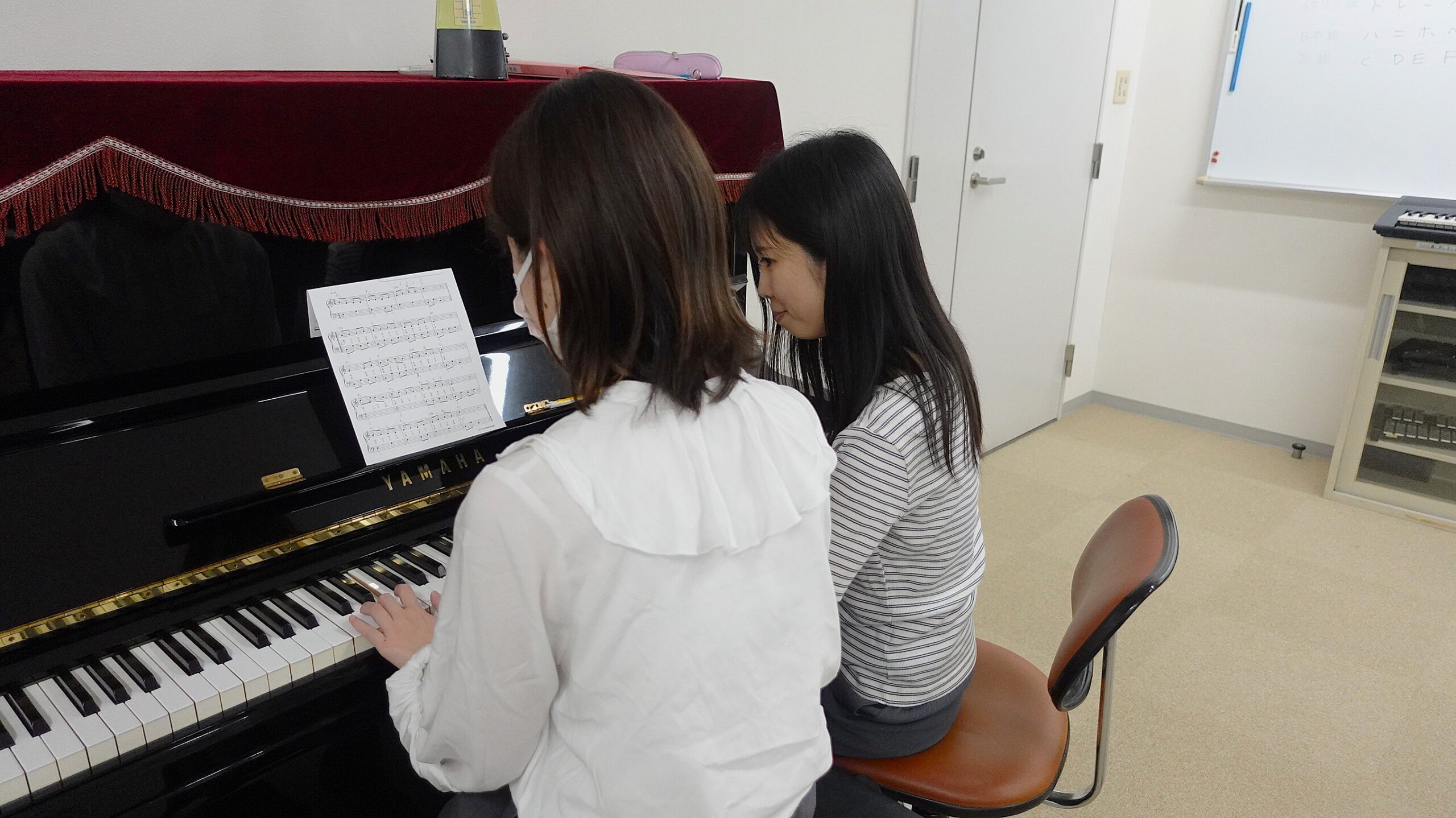 マンツーマン指導では学生が右手を弾き、講師が左手を弾いてリズムと和音をリードしながら演奏するという、二人三脚での場面もありました。緊張しながらも、学生たちは繰り返し練習に取り組みます。