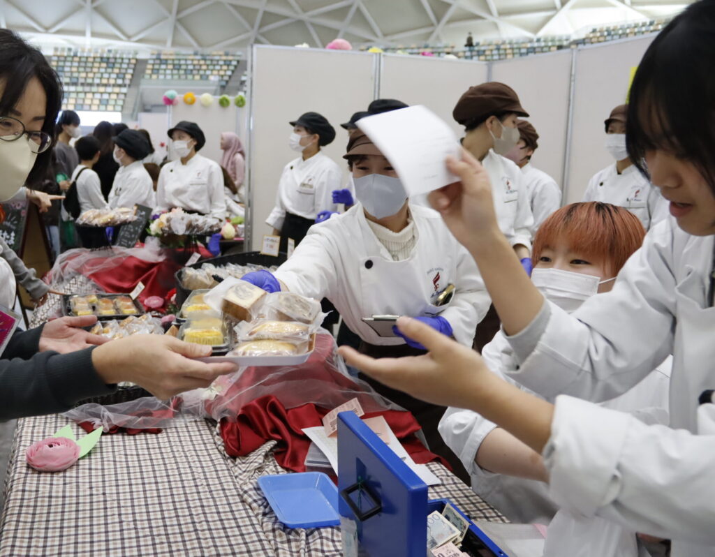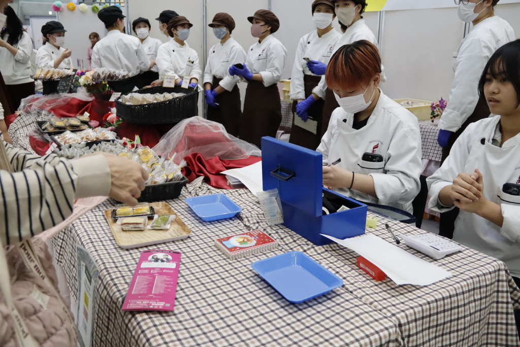 そしてもう一つの注目ポイントは、学生たちの接客。 実習服に身を包み、「いらっしゃいませ!」と笑顔でお迎えする姿は、まさにパティシエそのもの。 美味しいお菓子を作る技術だけじゃなく、お客様に喜んでもらうための「サービス・おもてなしの心」も、大切にしているスキルです。商品を手渡した時のお客様の笑顔が、何よりのやりがいでした!