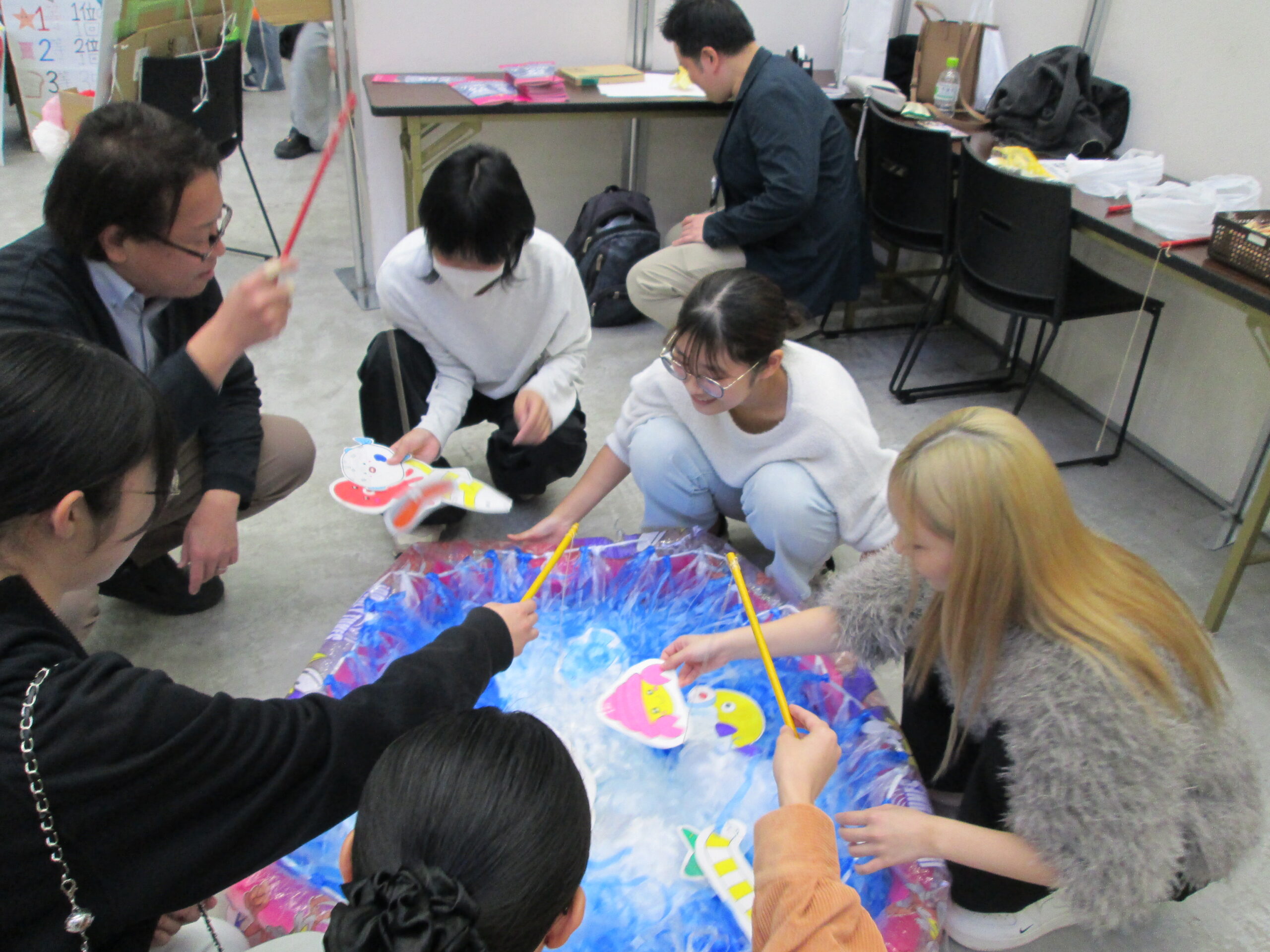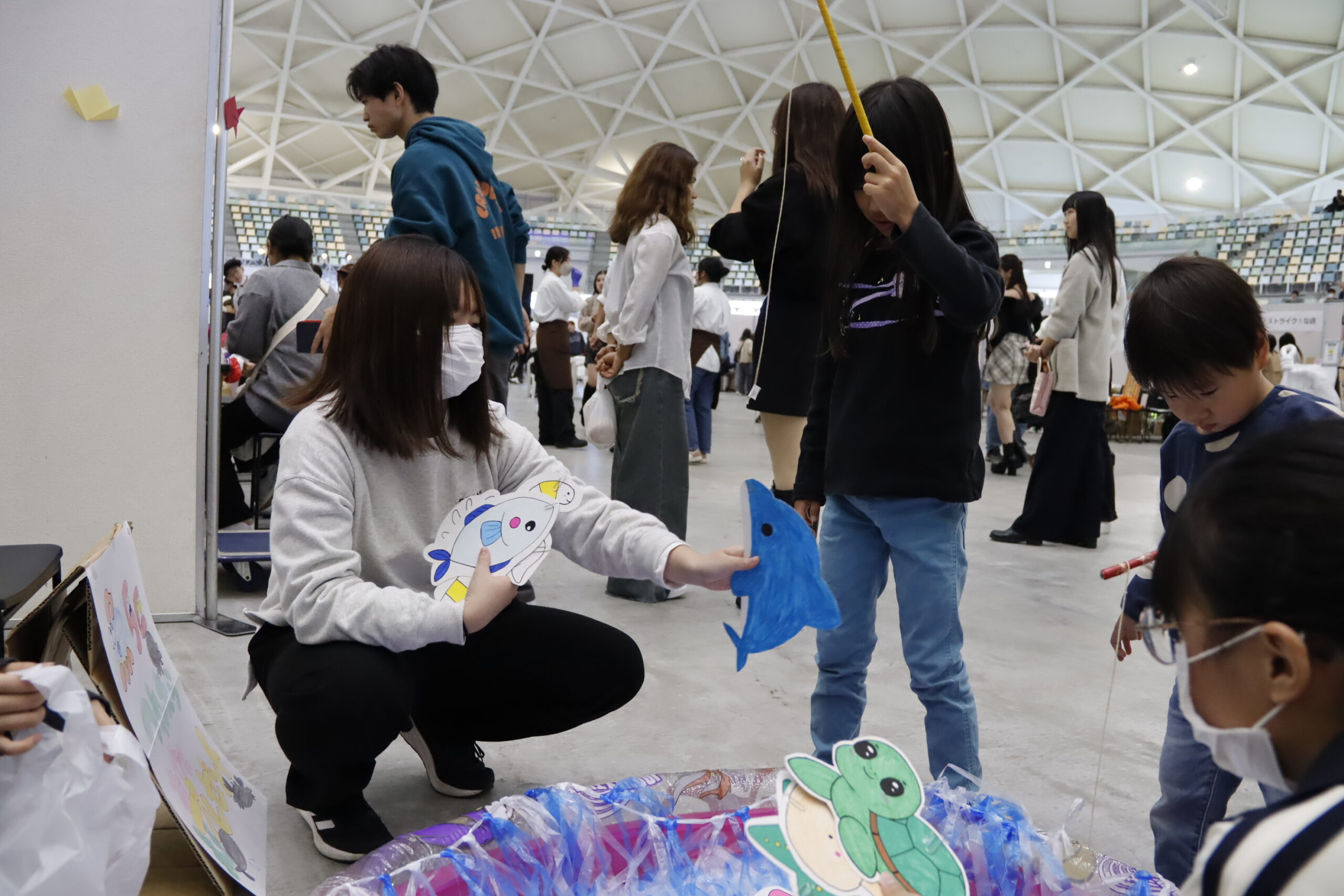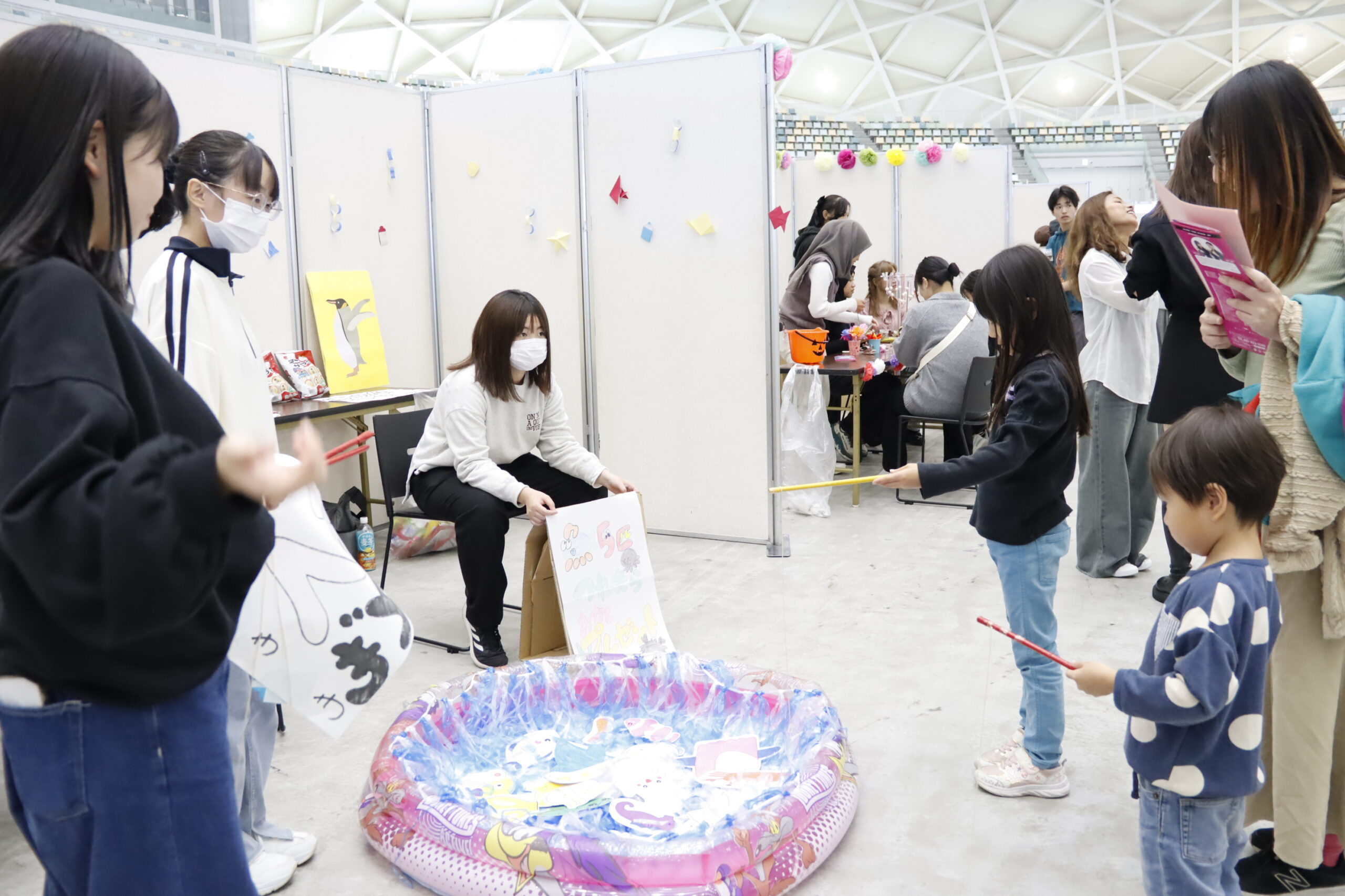 「穴吹祭」のアリーナ会場、広かったですね~!そんな中、ひときわ子どもたちの歓声でにぎやかだったのが、私たちのブース「おかし釣り&お面作り」です!