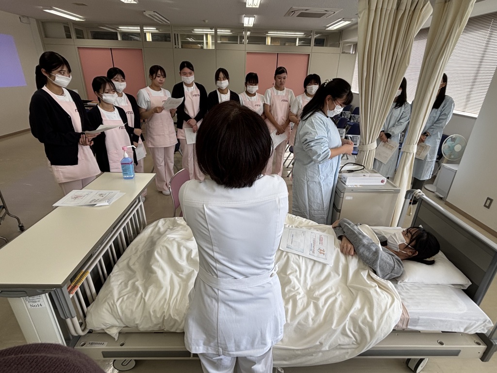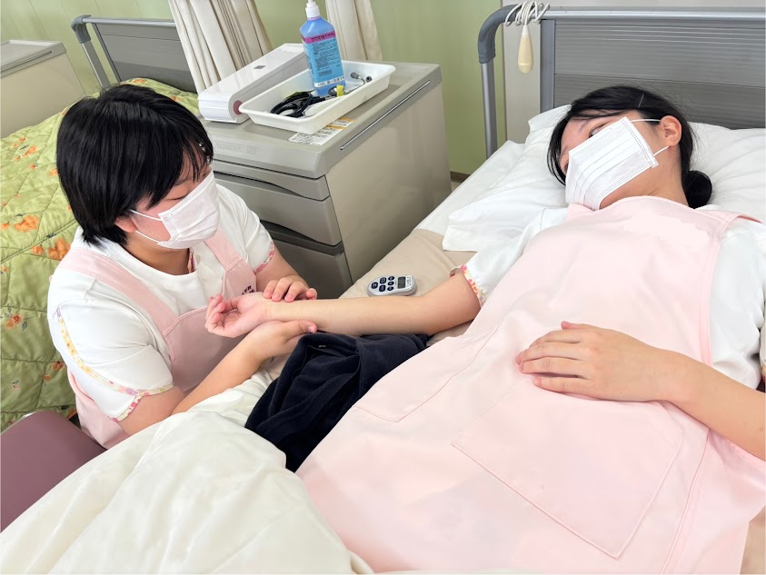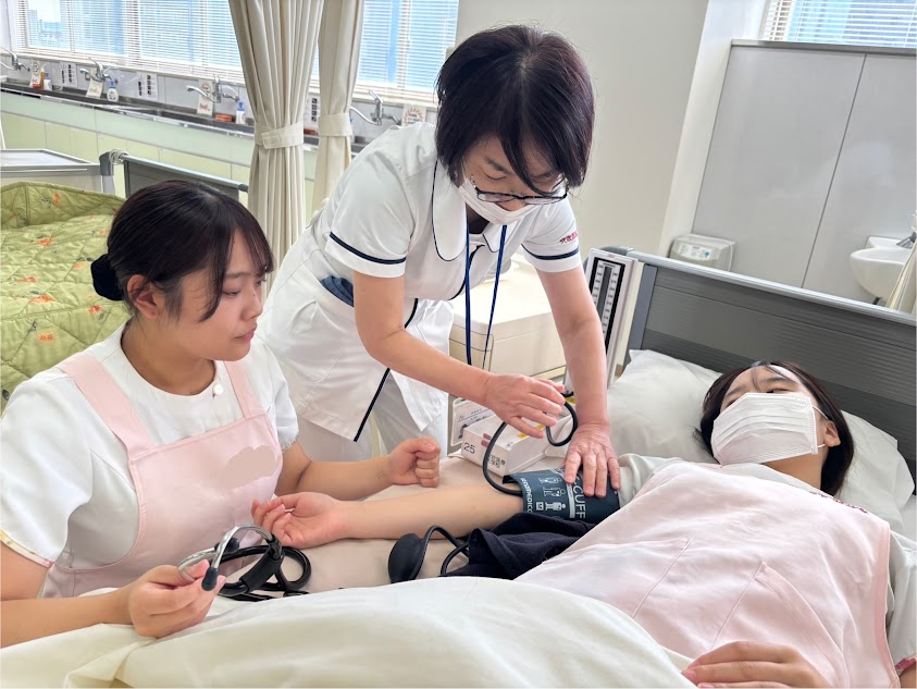 次は看護学科の実習室にあるベッドを使用し、血圧測定の実習! まずは看護学科の先生や4年生のレクチャーをしっかり見て学びます。