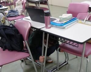 11月5日午前10時 県民いっせい地震防災行動訓練として「香川県シェイクアウト」に参加しました。 アナウンスのあと、3階各教室では、学生と教員が机の下に隠れたり身をかがめて「安全確保行動」とったりしました。いつ起こるかもしれない「災害」という、気持ちを忘れないようにするきっかけになりました。