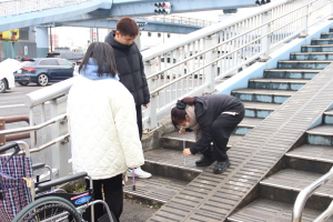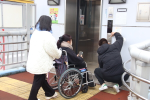 また、交差点に設置されている歩道橋では、車いすでエレベーターを利用し、