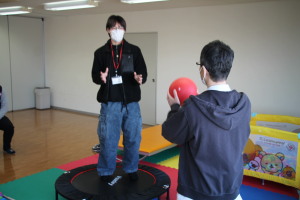 作業療法学科の体験では、前庭感覚を刺激する遊びを通して発達を促すプログラムを体験していただきました。